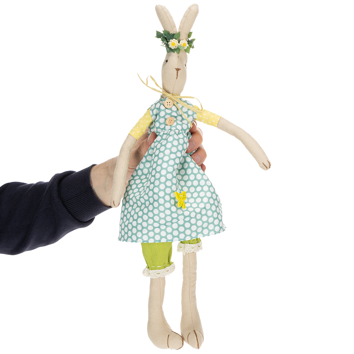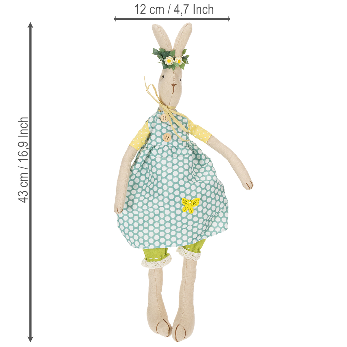 Den søde kaninpige er lavet af et enkelt naturligt stof og bærer en forårslignende blå kjole med store hvide prikker. Nedenunder fuldender ærmer i gule og hvide og smukke grønne haremsbukser med blondekanter kaninens outfit med kjole. Den smukke kanin fortryller også med skønne detaljer som træknapper og en sommerfugldekoration på kjortelen samt en enkel sløjfe lavet af papirbånd om halsen. Den udstoppede kanin bærer en filigrankrans af blomster på hovedet, som fuldender dens udseende.