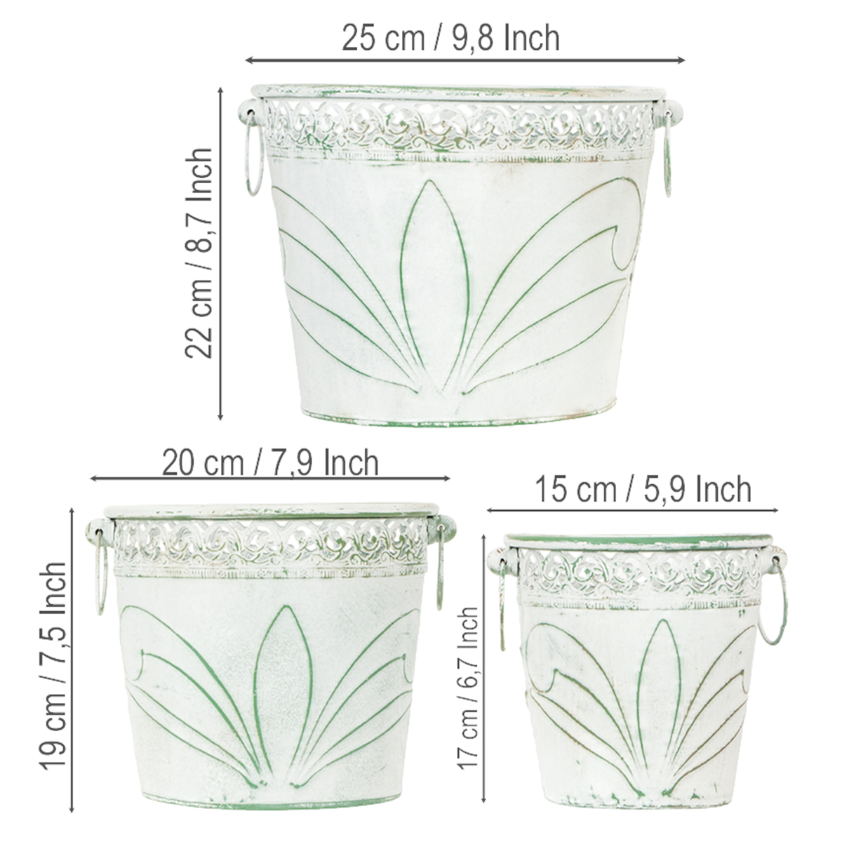 Præget metalplantekasse med håndtag, hvid og grøn, shabby chic stil, H22/19,5/17,5 cm, Ø25,5/20,5/15,5 cm, sæt med 3 stk.