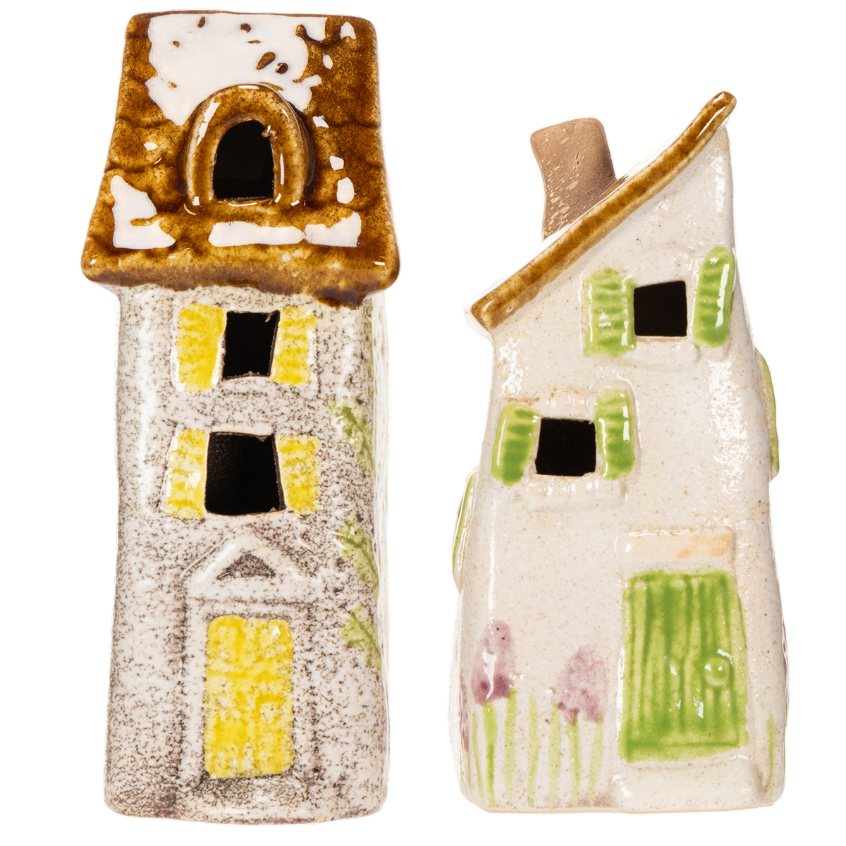 Rustikt keramikhus med lys LED, ideelt som stemningsfuld borddekoration, 15 cm, 2 stk.