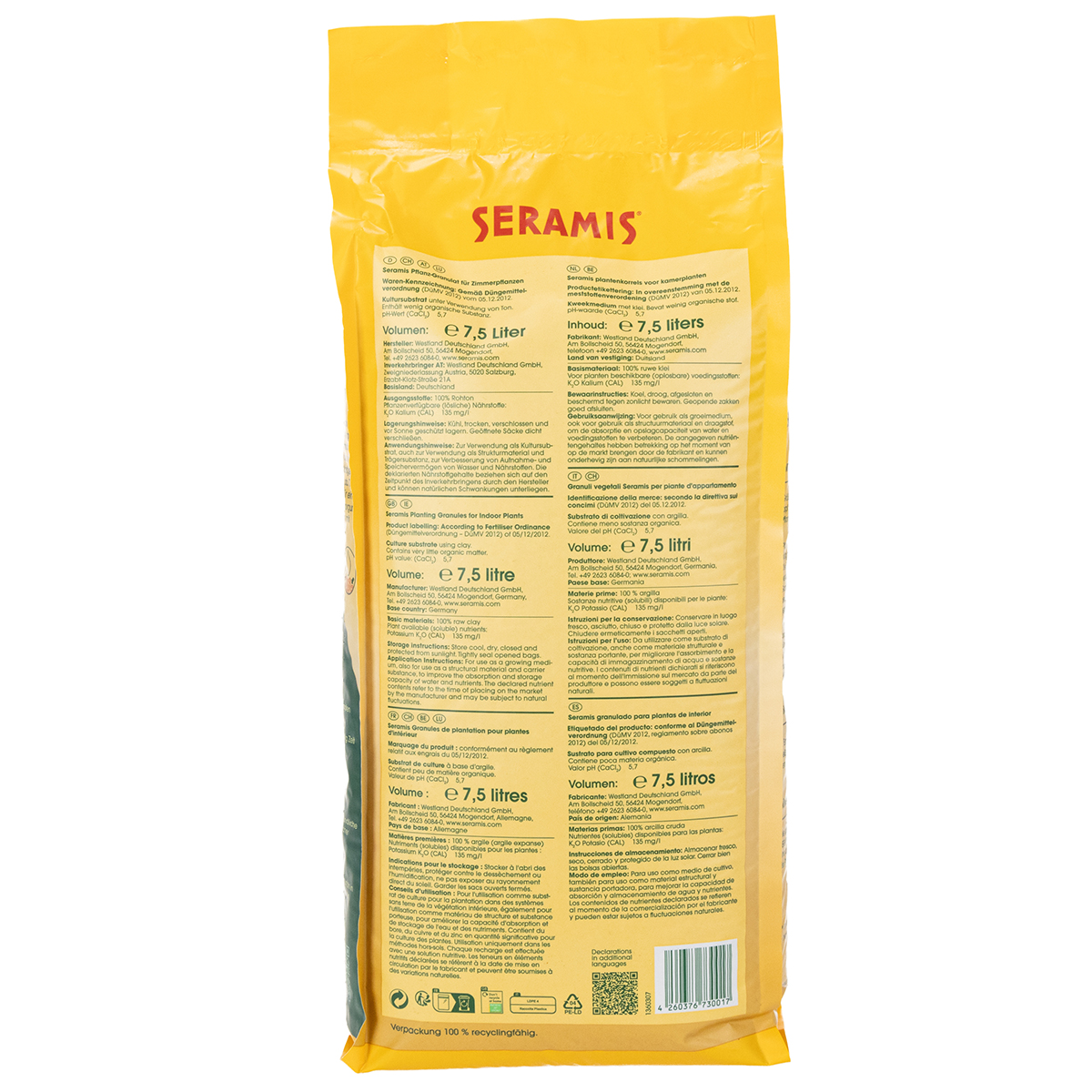 En stor pose med Seramis®-plantningskorn til indendørs planter har et volumen på 7,5 liter. Lad dine potteplanter trives sundt og pragtfuldt. Dine planter vil takke dig!