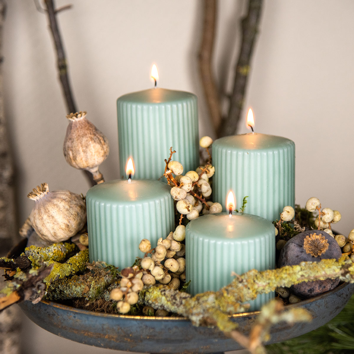 Søjlelysene leveres i en æske med fire - ideel til din adventspynt og perfekt som gave. Og leder du efter endnu flere muligheder for din lyspynt, finder du også søjlelys med og uden riller i forskellige størrelser og farver i vores butik.