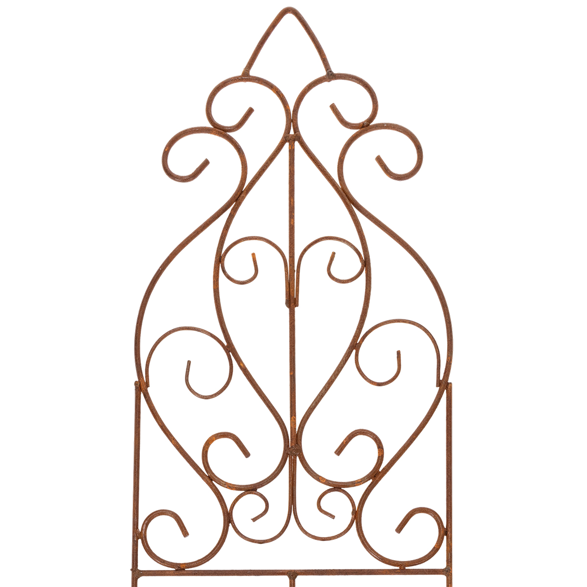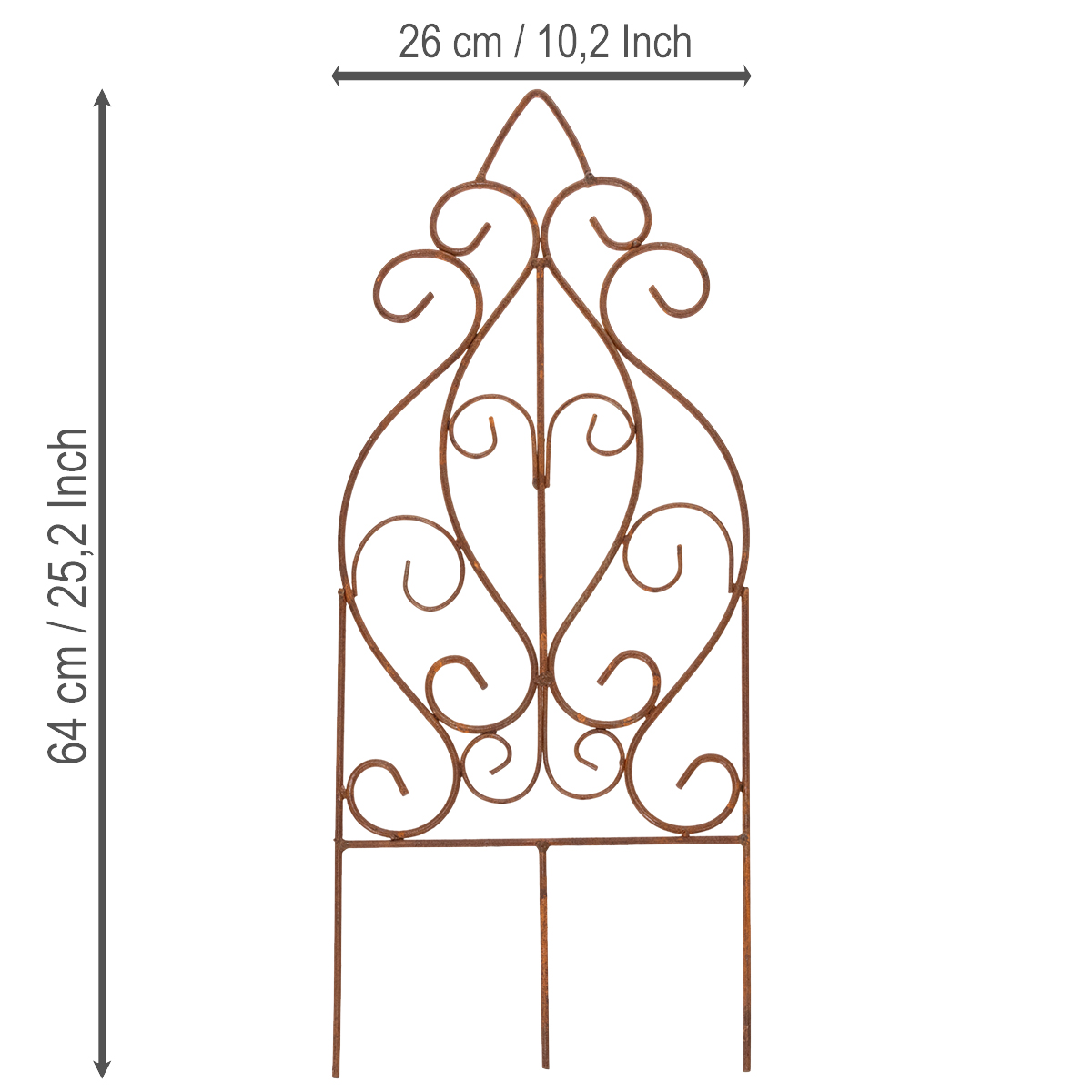 Dette rosenespalier imponerer med sin delikate, men robuste konstruktion. De kunstfærdigt buede former fremkalder klassiske havedesigns i landlig stil, samtidig med at de giver pålidelig støtte til dine klatreplanter, uanset om det er roser, klematis eller andre blomstrende skønheder. Forestil dig, hvordan friskblomstrende rosenranker yndefuldt snor sig om metalespalieret og forvandler din have til en blomstrende drøm! Med sin elegante rustfarvede finish passer espalieret harmonisk ind i en række forskellige udendørs omgivelser, hvad enten det er i blomsterbede, på terrasser eller som et dekorativt element ved din hoveddør.