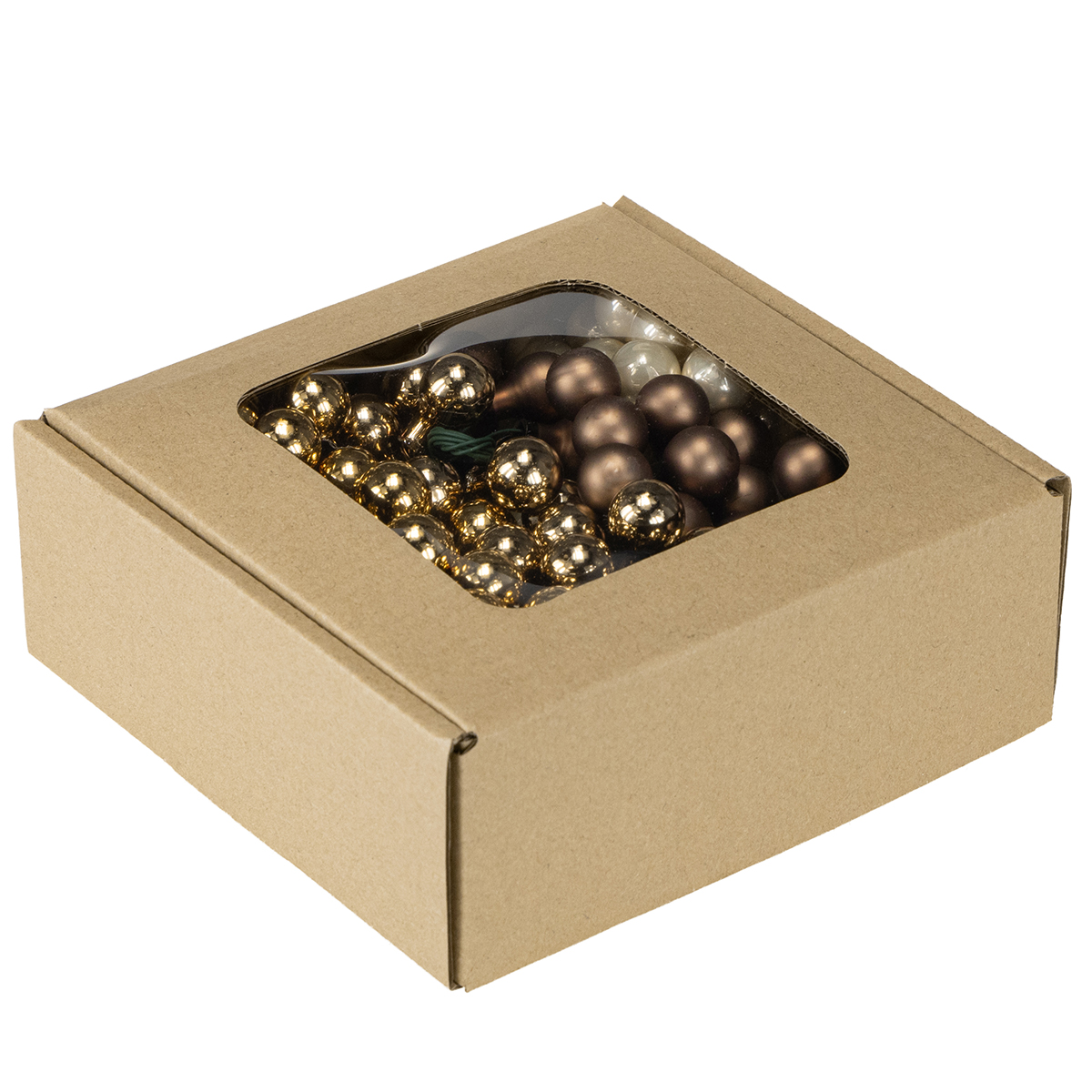 Spejlbærene i brun-guld er i et sæt på 140 stykker med i alt 4 forskellige farver i lige store dele: gammelt guld, hvidt og grøn-brunt i blank og rådyr i mat. De små glashoveder har alle en diameter på cirka 1,5 centimeter og inkl. Grøn håndværkstråd en størrelse på cirka 15 centimeter.