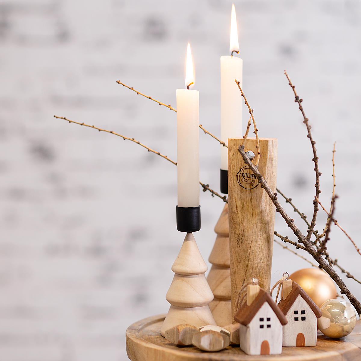 Giv dit hjem en varm og festlig atmosfære denne jul med denne fortryllende juletræsformede lysestage. Denne rustikke juledekoration, lavet af drejet, umalet træ, fremhæver materialernes naturlige skønhed. Det håndlavede juletræ med lysestage er et sandt højdepunkt i enhver stueindretning. En sort metallysestage sidder på toppen af træet, der står i kontrast til det lyse naturtræ og giver designet et moderne præg. Med en højde på cirka 16 cm er den perfekt til både advents- og festlig borddekoration. Opdag de mange måder at integrere denne minimalistiske lysestage i din juleindretning og forbedre den rustikke elegance i dit hjem. Brugen af FSC-certificeret træ garanterer miljøvenlig produktion.