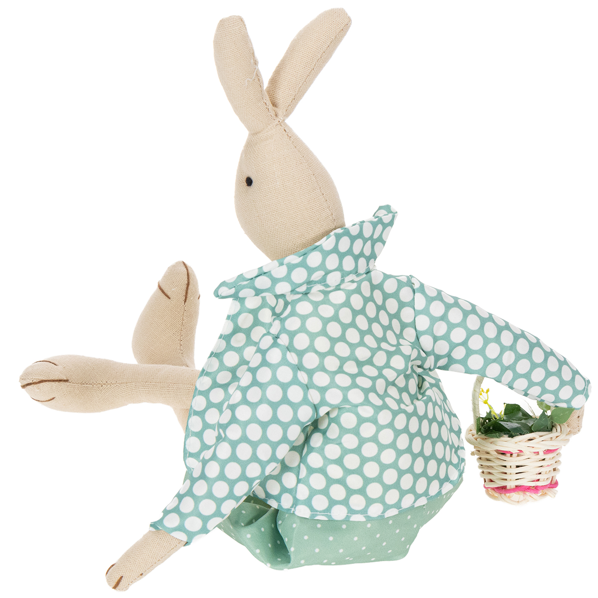 Denne bunny dreng blev håndlavet med stor sans for detaljer. Kaninen var lavet af naturstof og klædt i en gul skjorte med hvide prikker og træknapper, bukser og en matchende jakke i turkis, ligeledes med prikmønster. Påskeharen bærer en simpel papirsløjfe om halsen. Kaninmanden medbragte en lille plantet blomsterkurv.