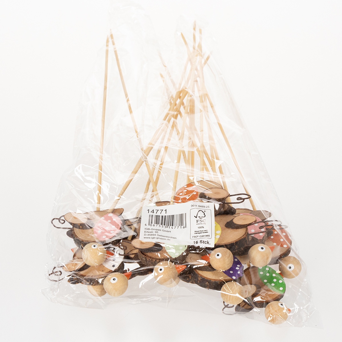 I alt modtager du 16 farverige træpæle, fordelt på otte forskellige designs. Hvert design skaber sin egen harmoniske atmosfære. De livlige farver kombineret med det naturlige trælook gør fuglene til et sandt blikfang. Uanset om de arrangeres enkeltvis eller kombineres med andre dekorative genstande såsom forårsblomster eller sæsonkranse, ser disse små træfugle fantastiske ud overalt. De er også en fantastisk gave til haveentusiaster eller en dejlig lille gave til havefester!