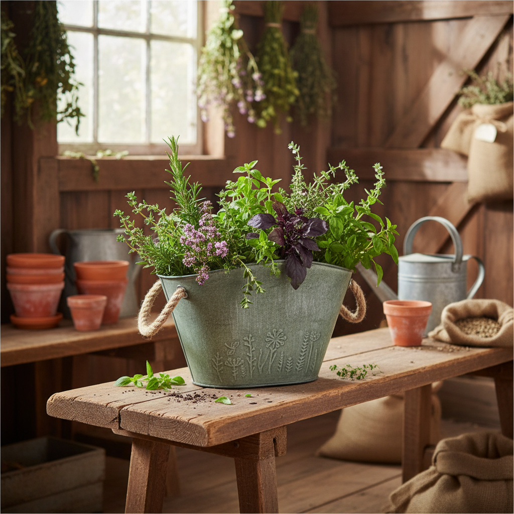 For endnu mere blomsterdekoration i metalpottekasser anbefaler vi at kombinere denne urtepotte med hanke og den større plantekrukke i et lommedesign!
