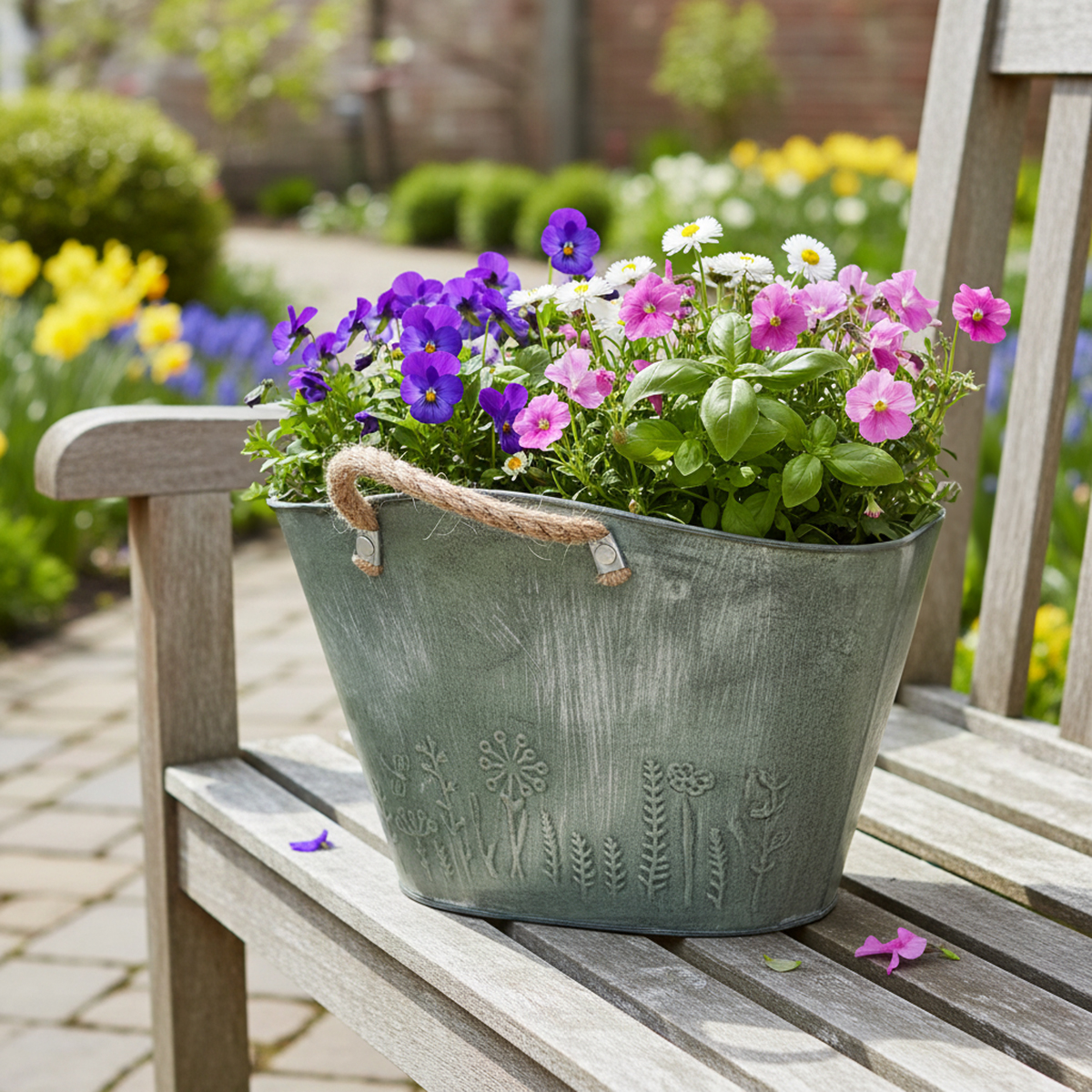 For endnu mere blomsterdekoration i metalpottekasser anbefaler vi at kombinere denne urtepotte med hanke og den større plantekrukke i et lommedesign!