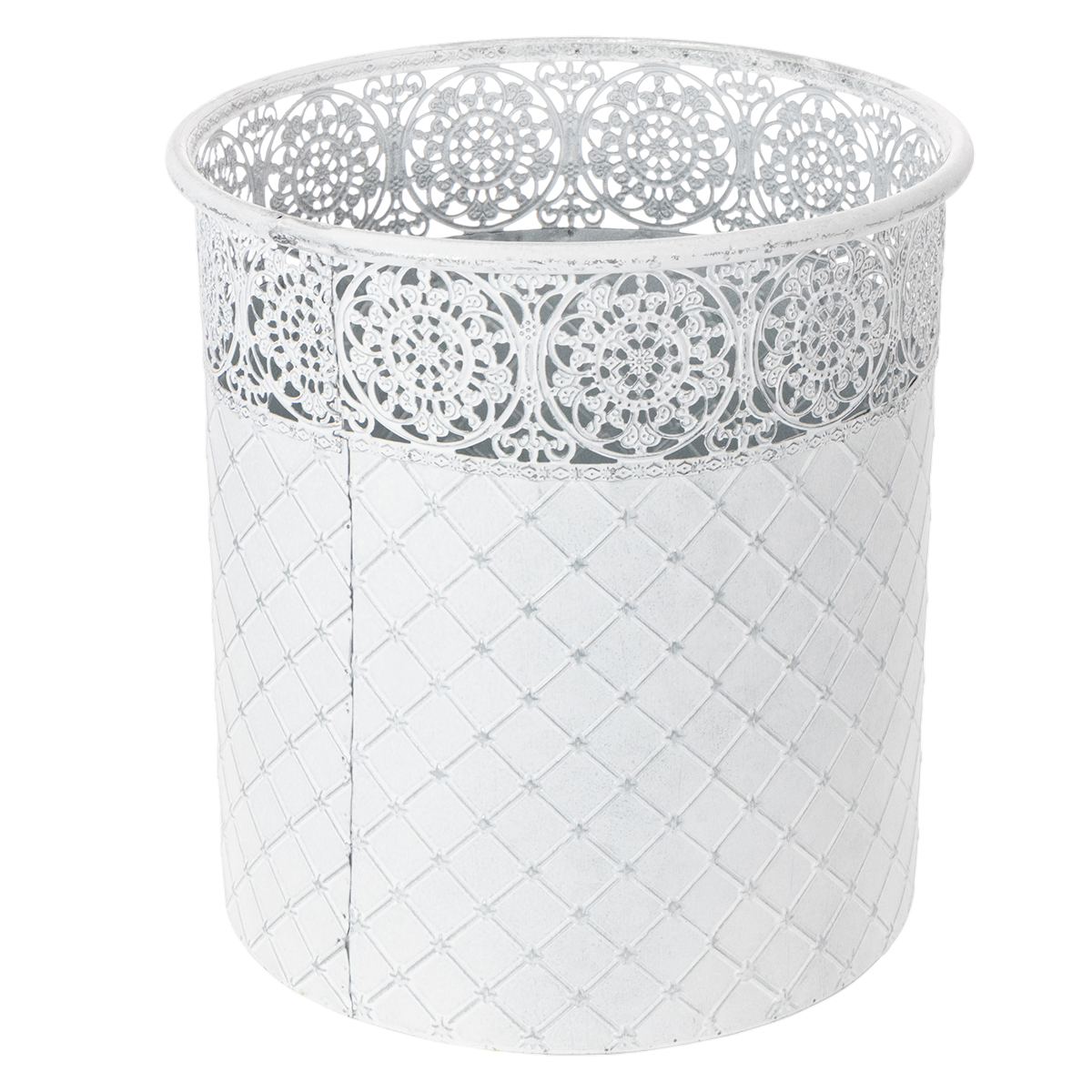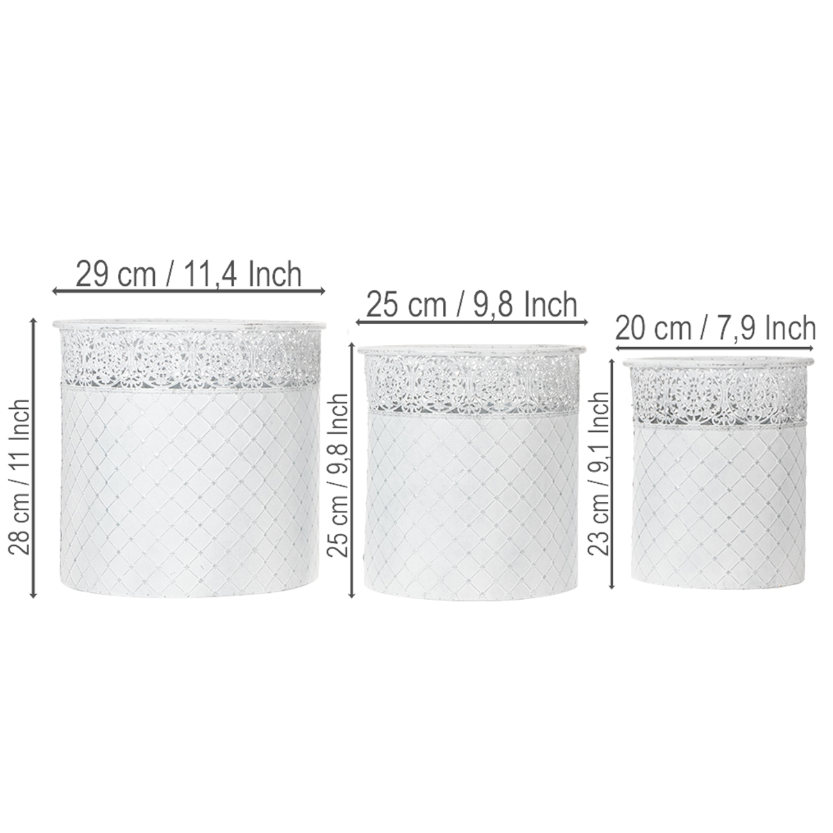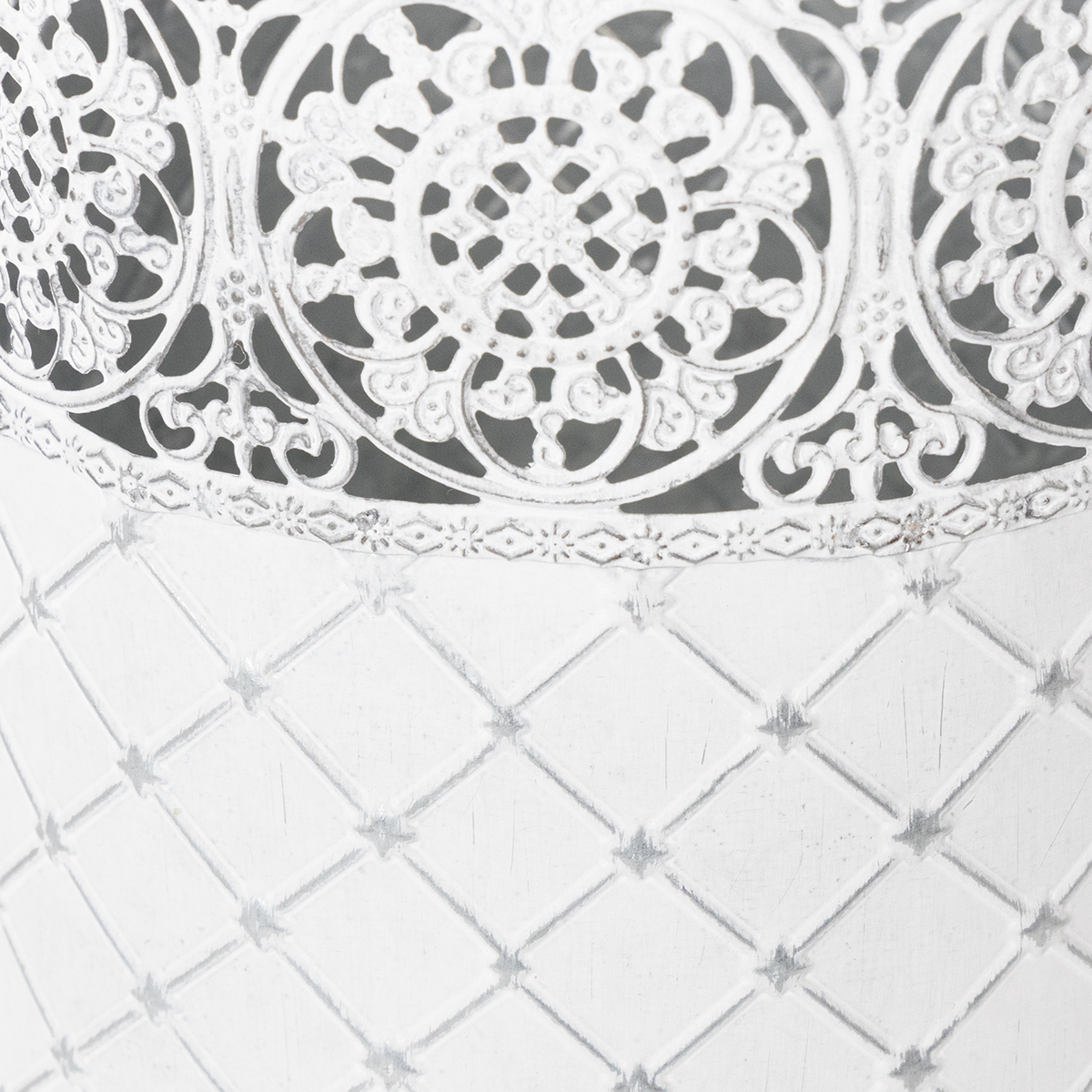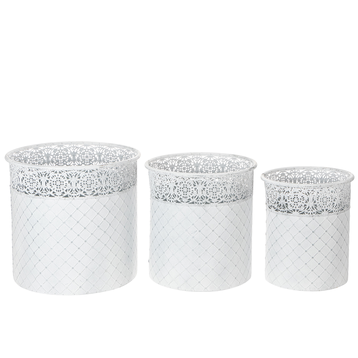 Denne plantepotte med blondemønster i hvid kommer som et sæt med 3 højkvalitets metalkar i trendy shabby chic! Den hvide farve på den dekorative spand lader metalkarrets sølv skinne igennem på prægning og kanter.