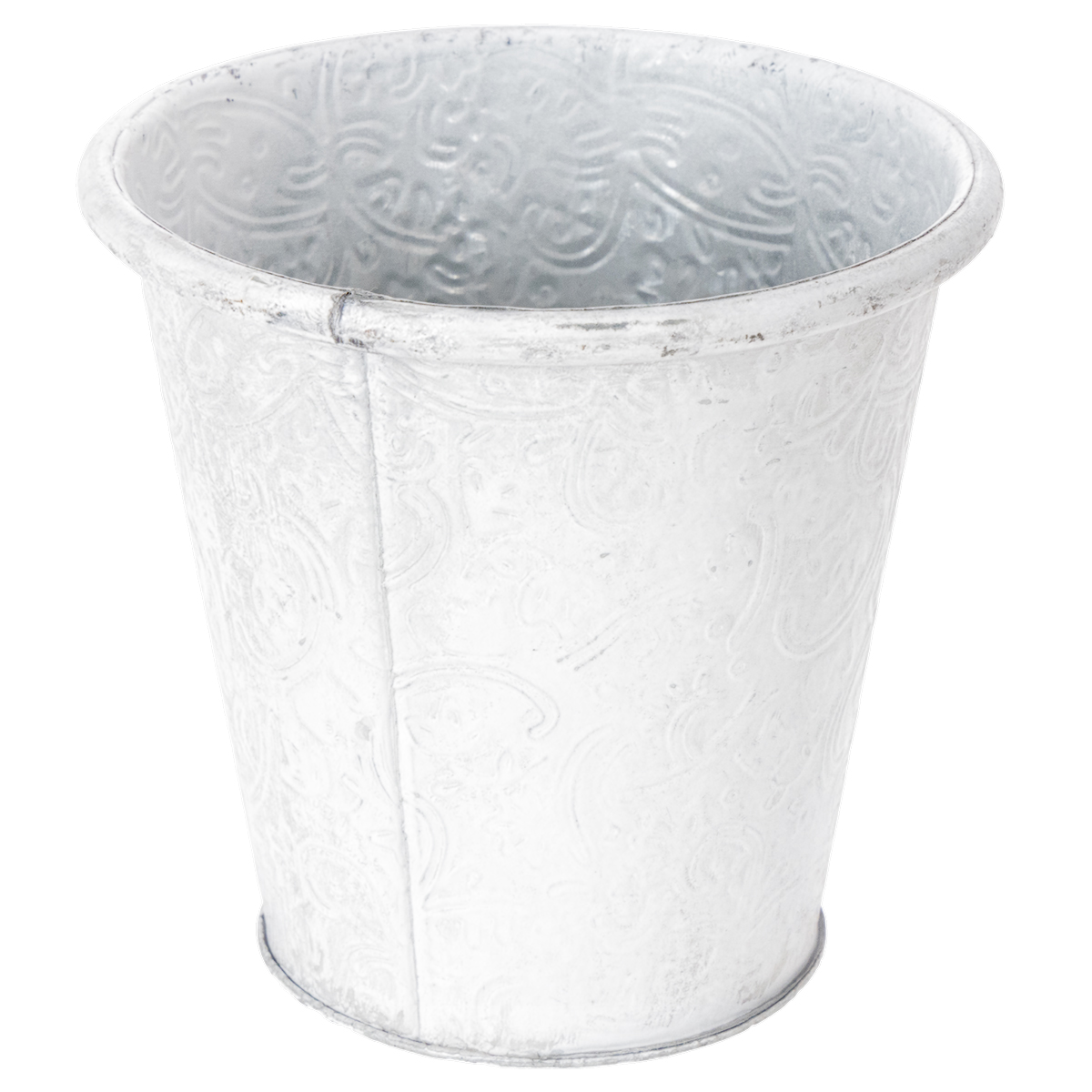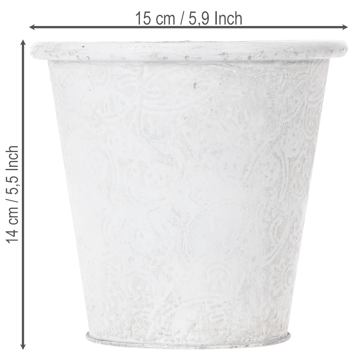 Denne plantekrukke med prægede ornamenter i hvid er en vidunderlig plantekrukke til dine yndlingsforårsblomster! Men også en lang række redskaber, såsom kuglepenne, kosmetiske børster og børster eller små havehjælpere finder en fantastisk plads i dette smukke metalkar i trendy shabby chic!