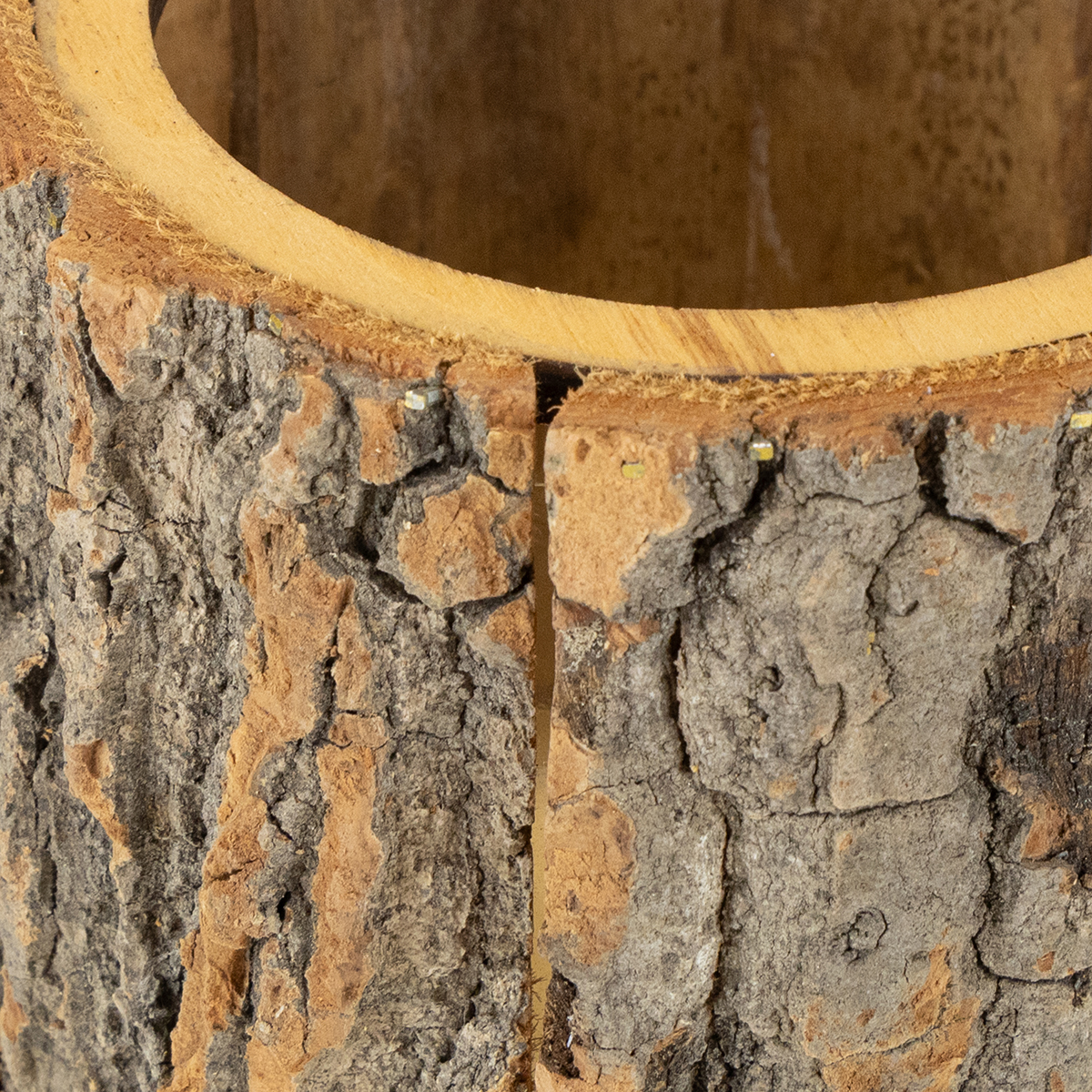 Det, der ligner en lille træstamme til plantning, er en rund beholder lavet af stykker og stykker træ sat sammen. Forskellige planter kan bruges gennem åbningen i toppen.