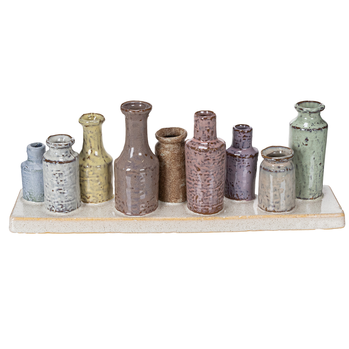 - 9 små, håndlavede keramiske vaser i matchende farver