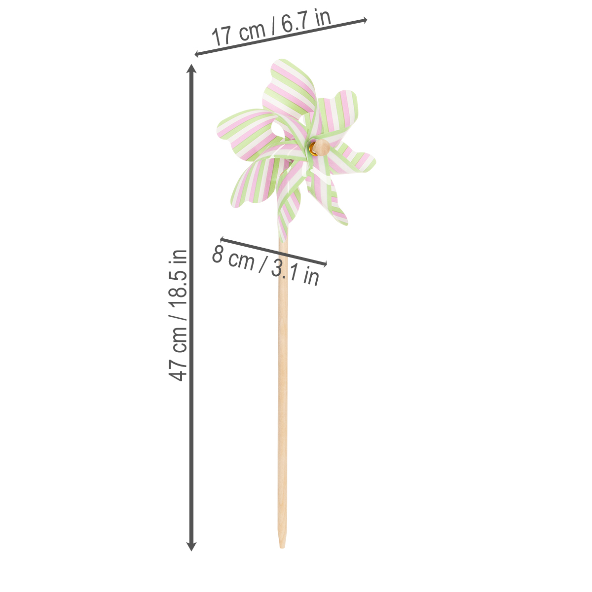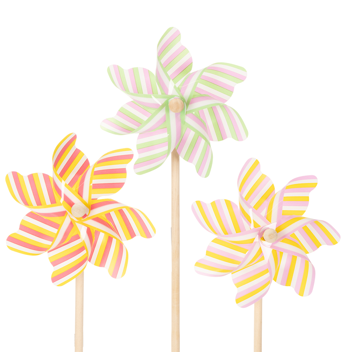 - Sæt bestående af 3 stribede vindmøller i sarte pastelfarver